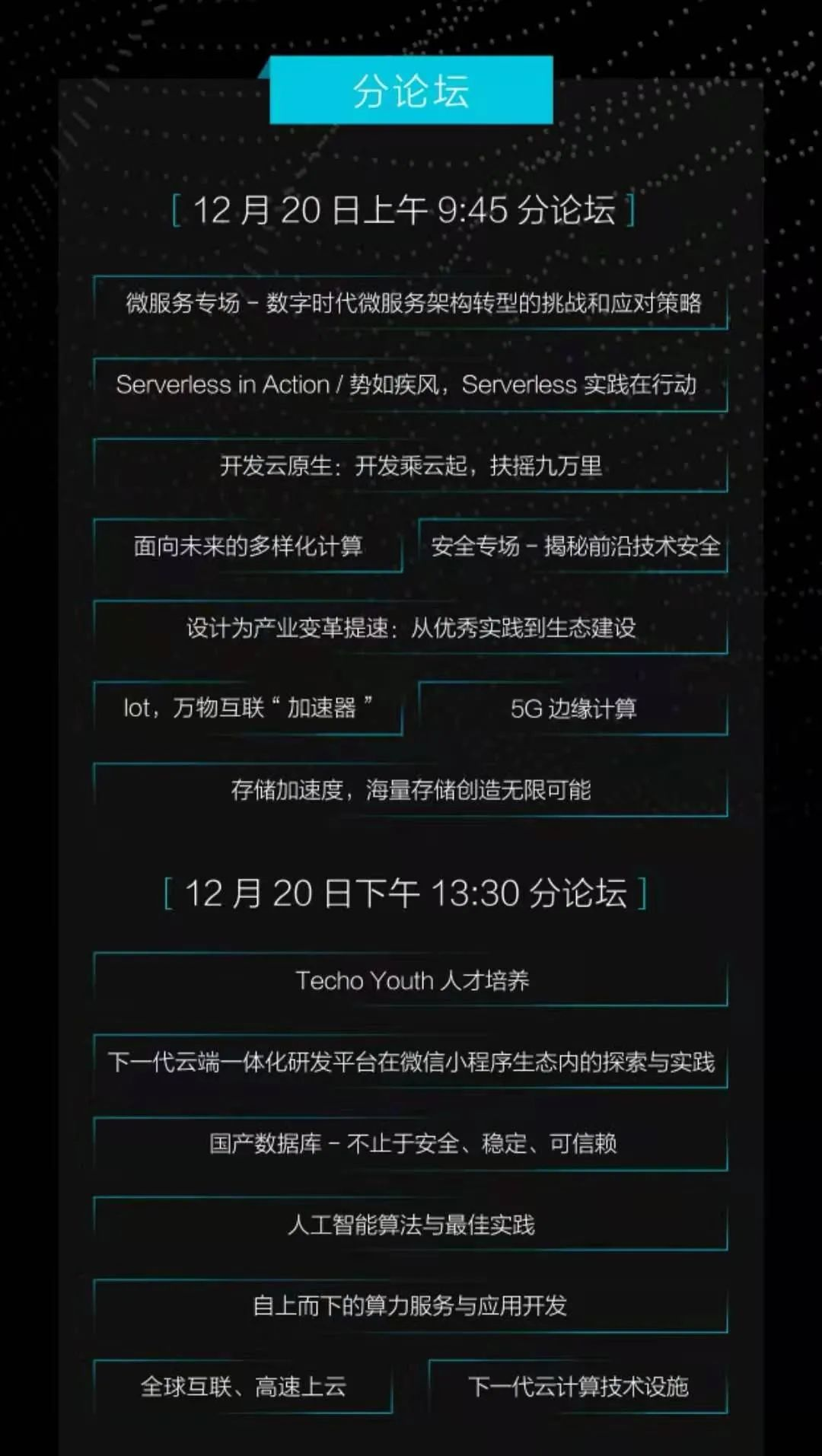 除了大咖云集的主论坛,本届大会还将围绕虚拟化、计算、存储、网络、数据库、大数据、人工智能、Serverless、容器、微服务、DevOps、5G边缘计算、软硬一体化、区块链、物联网等多个热点话题,设置29场技术分论坛,邀请垂直领域顶级的技术专家,为与会者奉献一场干货满满的云端饕餮盛宴。