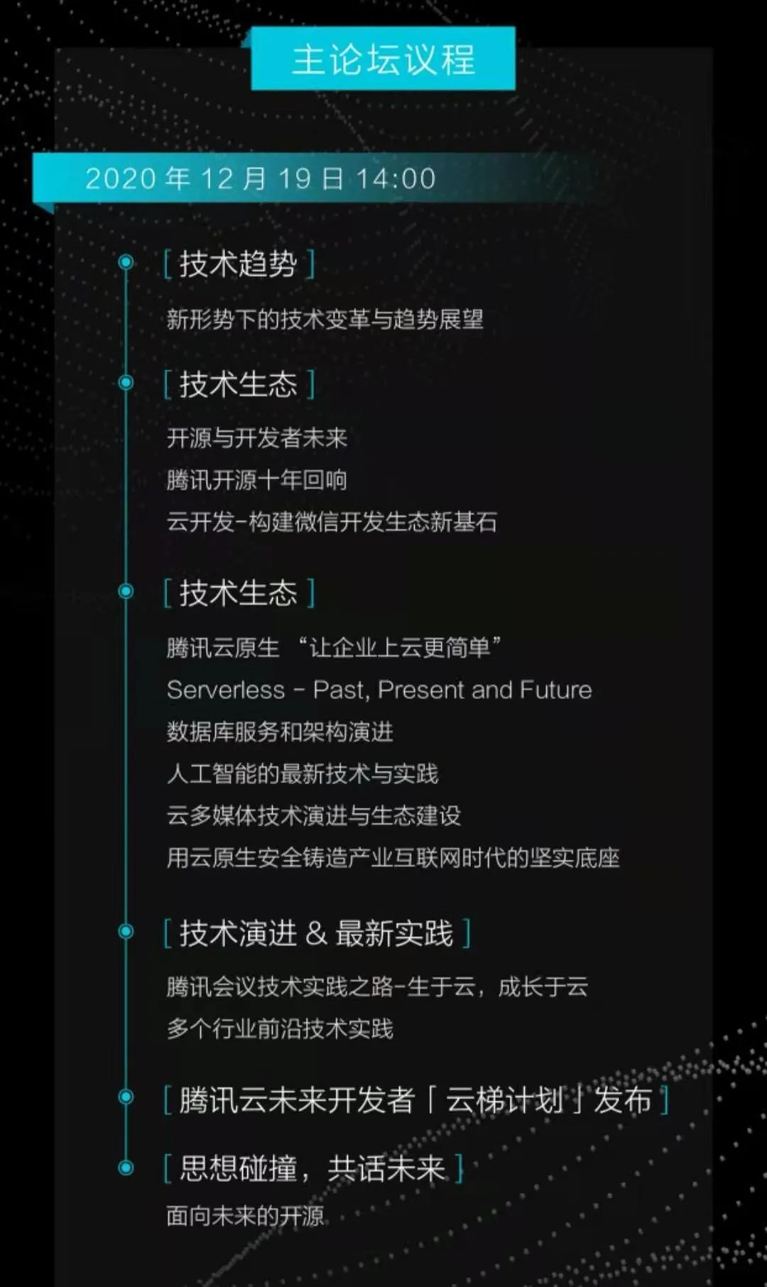 12月19日至20日,腾讯主办的2020 Techo Park开发者大会将在北京召开。大会设1场主论坛、29场垂直技术分论坛及多场活动,众多专家将分享云计算、大数据、人工智能等前沿技术。还开设线上直播,报名通道已开启。