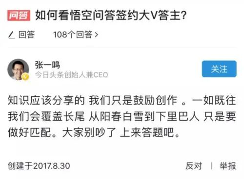 在悟空问答一口气签约超300个知乎大V的消息曝出后,知乎联合创始人张亮表示:“他以为中国就300个写作的人?”张一鸣回应,“觉得知乎创始人张亮对自己平台作者有点傲慢。”