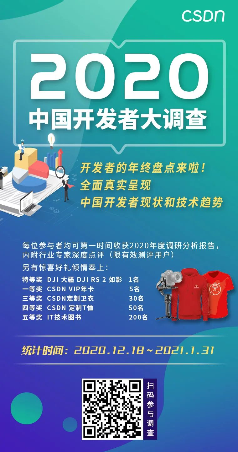 同时为了更真实地呈现这一年中国开发者现状与技术趋势,优快云 发起《2020 中国开发者大调查》,探索最具前景的技术,揭秘最实用的工具,解析最热门的领域,欢迎参与,还有重磅礼品等你拿哦!