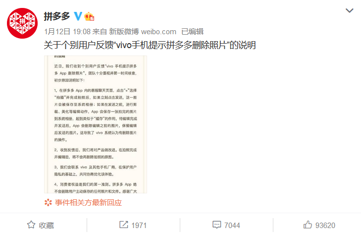 1月12日晚间,针对网友爆料被拼多多APP远程删除照片一事,拼多多在官方微博上发布说明回应,称删除图片为用户编辑前的原图,承诺将对产品做改进,“在拍照完成并编辑后,将不会再删除拍照的原图。”