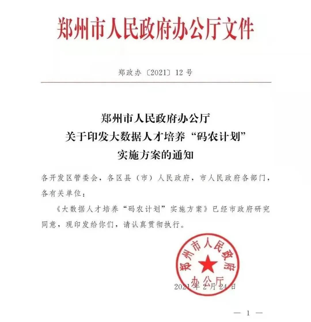 近日,郑州市政府办公厅印发《大数据人才培养“码农计划”实施方案》,《方案》要求,力争用3年左右时间,共建一批现代产业学院和高水平实训基地,为郑州市大数据产业储备10万名有专业技术水平和实践操作经验的人才,加快推进全市大数据产业发展。
