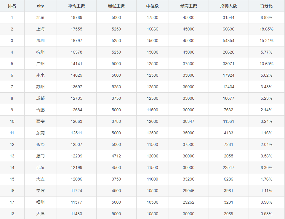 2021年3月采集数据124176条。2021年3月全国程序员平均工资15189元,工资中位数12500元,其中95%的人的工资介于5250元到37500元。