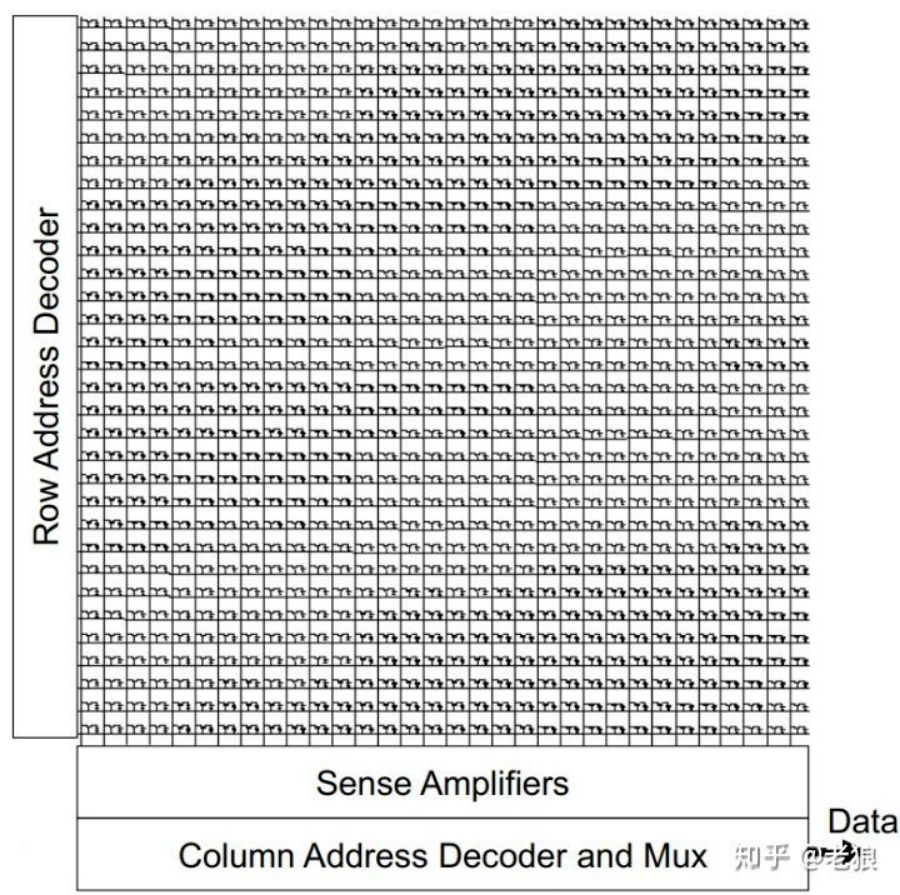 再缩小一下看,它们密密麻麻的排列着,每一个位都由行地址和列地址来确定的: