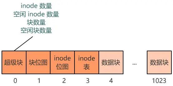 那我们就再占用一个块来存储这些数据吧!由于他们看起来像是站在上帝视角来描述这个文件系统的,所以我们把它放在最开始的块上,并把它叫做超级块,现在的布局如下。