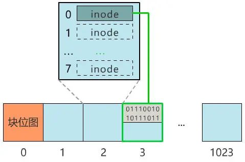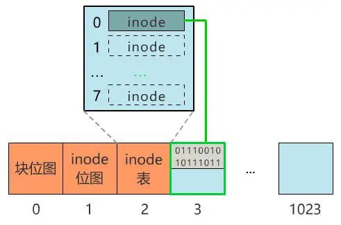 同时,我们把 inode 信息,放在 2 号块,一共存 8 条 inode,这样我们的 2 号块就叫做 inode 表。