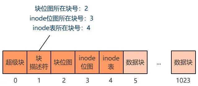 很简单,与超级块记录信息一样,这些信息也选择一个块来记录,就不怕了。那我们就选择紧跟在超级块后面的 1 号块来记录这些信息吧,并把它称之为块描述符。