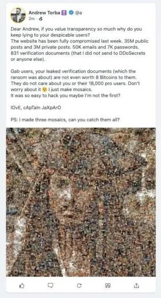 这篇帖文一发,鉴于 Torba 在 Gab 上拥有 280 万粉丝的强大影响力,许多人都得知了 Gab 在第一次被黑之后,黑客与 Gab 之间的这个谈判条件。此外,这位不知名的黑客还指责 Torba 没有公布第一次遭入侵的全部范围。