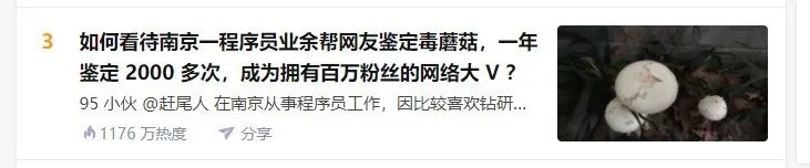 近日,有媒体爆料南京一程序员利用业余时间,研究菌物做科普,去年帮网友鉴定毒蘑菇达 2000 余次,成为拥有百万粉丝的网络大 V。随后,这一新闻登上知乎热搜前三,不少程序员同行发出了由衷的佩服!