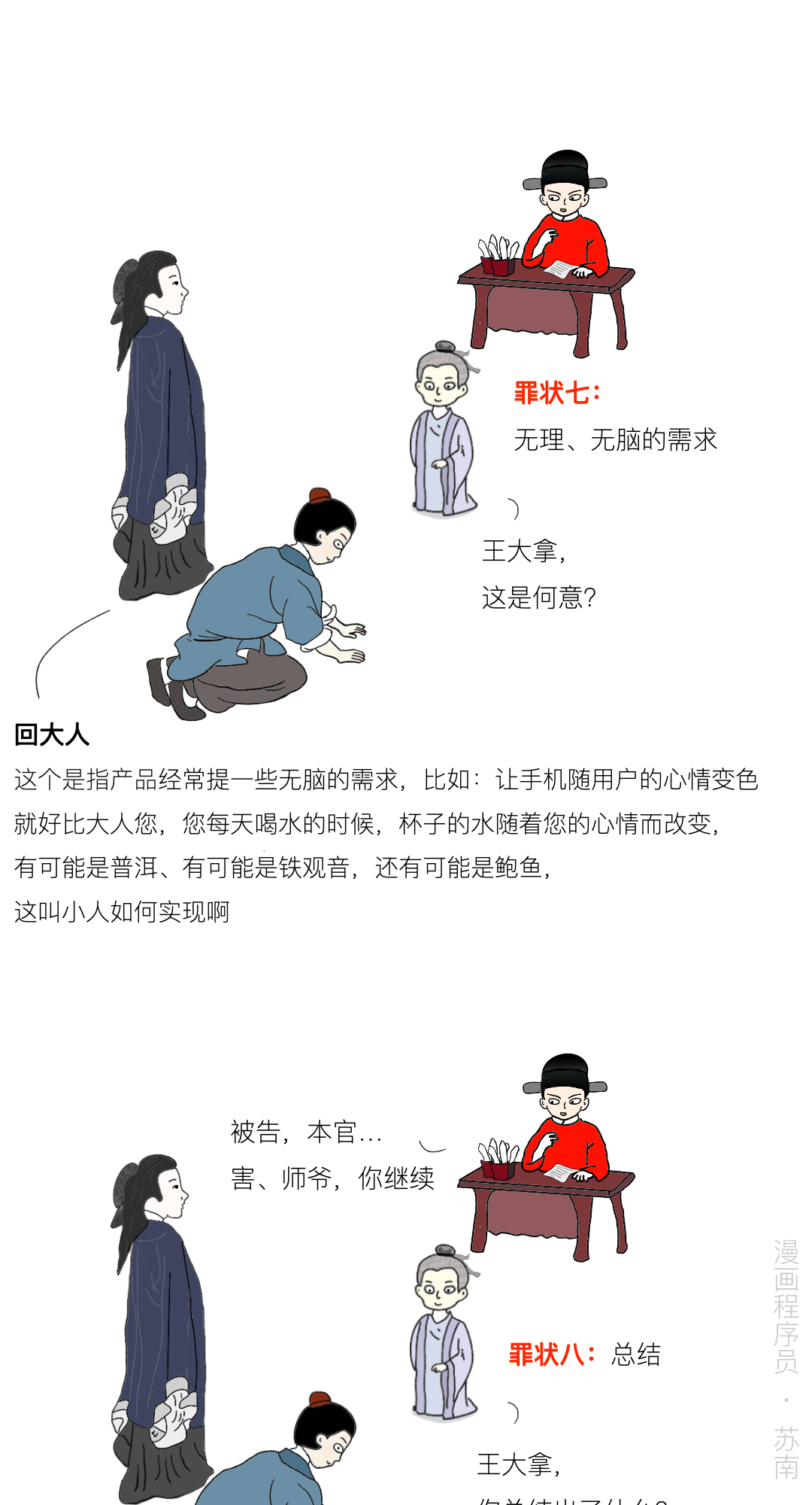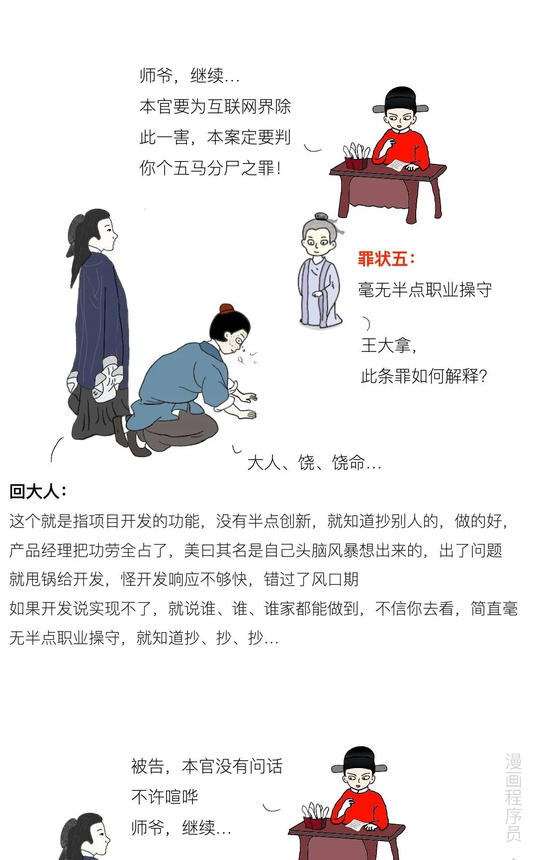 这篇漫画是「 程序员状告产品经理八大罪状 」的下集,你认为上半部分的罪状证词是否合理呢?是否与你工作中产品经理的很为相符?
