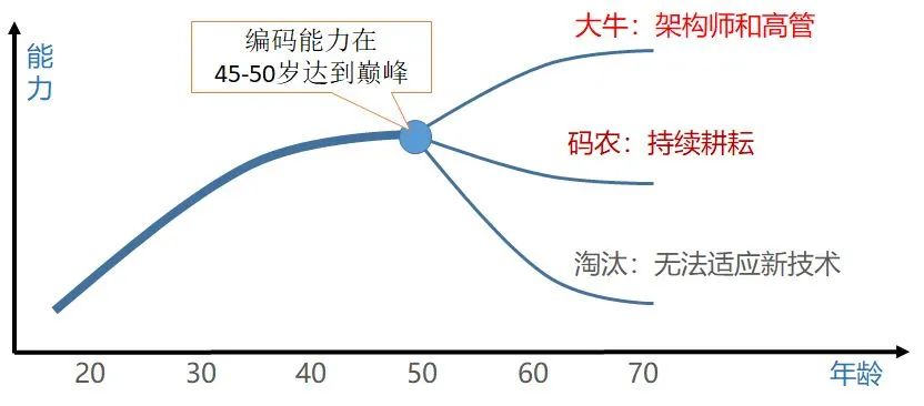 根据美国一项能力统计显示,程序员编码能力在45-50岁达到巅峰。因体力、记忆力影响,此后将总体进入下降通道。
