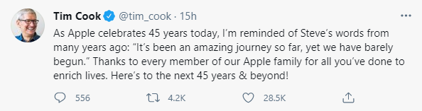 而2021年4月1日,正是苹果公司成立的第 45 周年,苹果现任 CEO 蒂姆·库克也发推纪念这天: