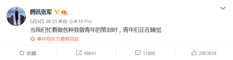 5月4日上午,腾讯公关总监张军发博写道:”当我们忙着做各种致敬青年的策划时,青年们正在睡觉”。不料,该言论引起网友们的不满,称“难道各种致敬青年的策划不是青年们做的吗”、“对青年最大的敬意就是让青年好好睡个觉”。