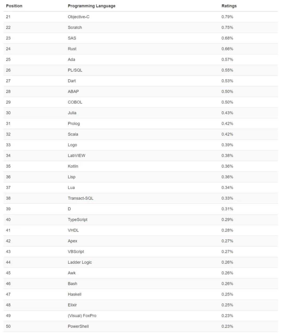 在本月榜单中,Rust 从上个月的第 29 名上升到了本月的 24 名,其生态在各个科技大厂的支持下,也大有进入 TOP 20 的潜力。