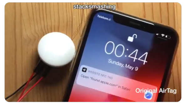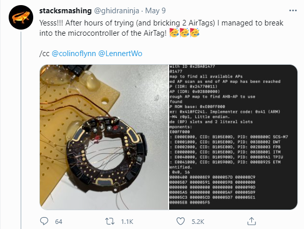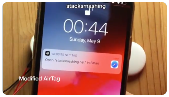 可是,就在 AirTag 正式发售的第 10 天(AirTag 于 4 月 30 日正式发售),即 5 月 9 号苹果就被“打脸”了:一位德国安全研究人员 Stack Smashing 发推表示他能“入侵 AirTag 的微控制器”,还能修改其丢失模式下的 NFC URL,而这个 URL 可被黑客用于网络钓鱼或其他任何入侵操作!