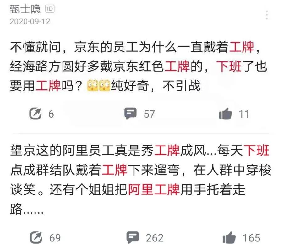 除了字节跳动,下班时间,各大厂工牌或多或少都会在一些公共场合出现。有的人是因为忘记摘了,有的人是因为还要回去加班懒得摘,还有人故意不摘以展现自己大厂员工的身份。