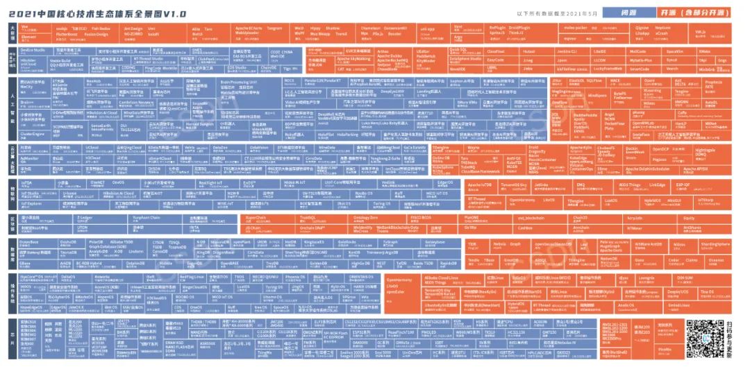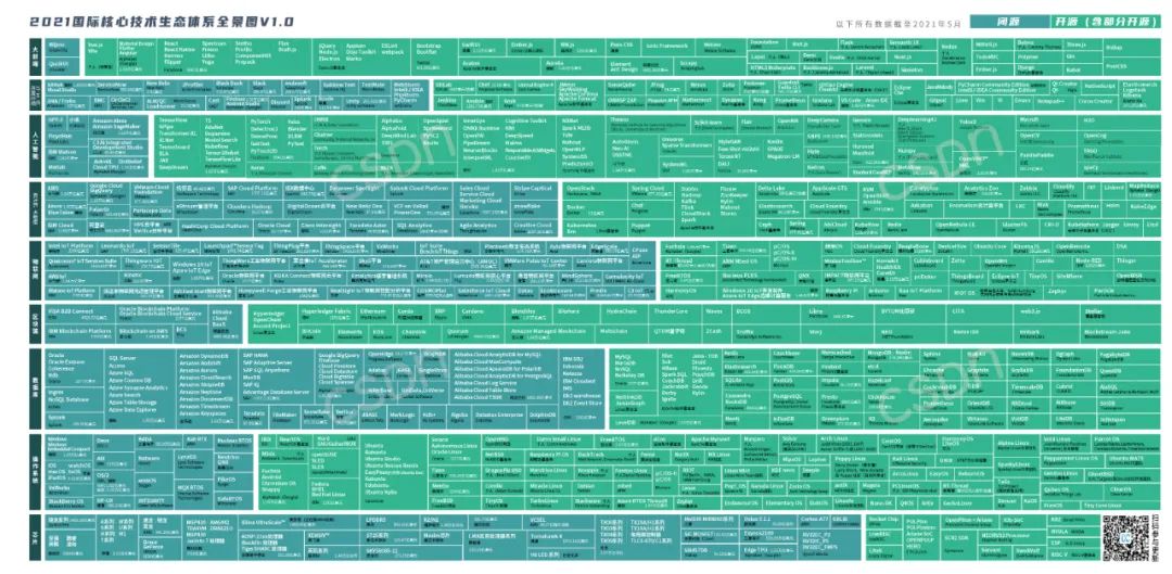 除了以上,我们在调研全球 1500+ 主流技术产品与平台后,全方位呈现《2021国际核心技术生态体系全景图V1.0》和《2021中国核心技术生态体系全景图V1.0》,覆盖大前端、开发环境与工具、人工智能、云计算和大数据、物联网、区块链、数据库、操作系统、芯片九大技术领域。