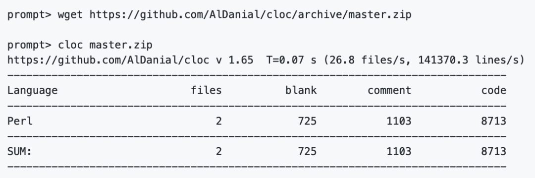 还有一些现成的代码统计工具,比如 cloc 。通过命令行使用,可以直接分析本地或者 GitHub 上的代码包。支持按语言分类统计代码空行、注释行、自然行数等,还能单独分析指定提交。
