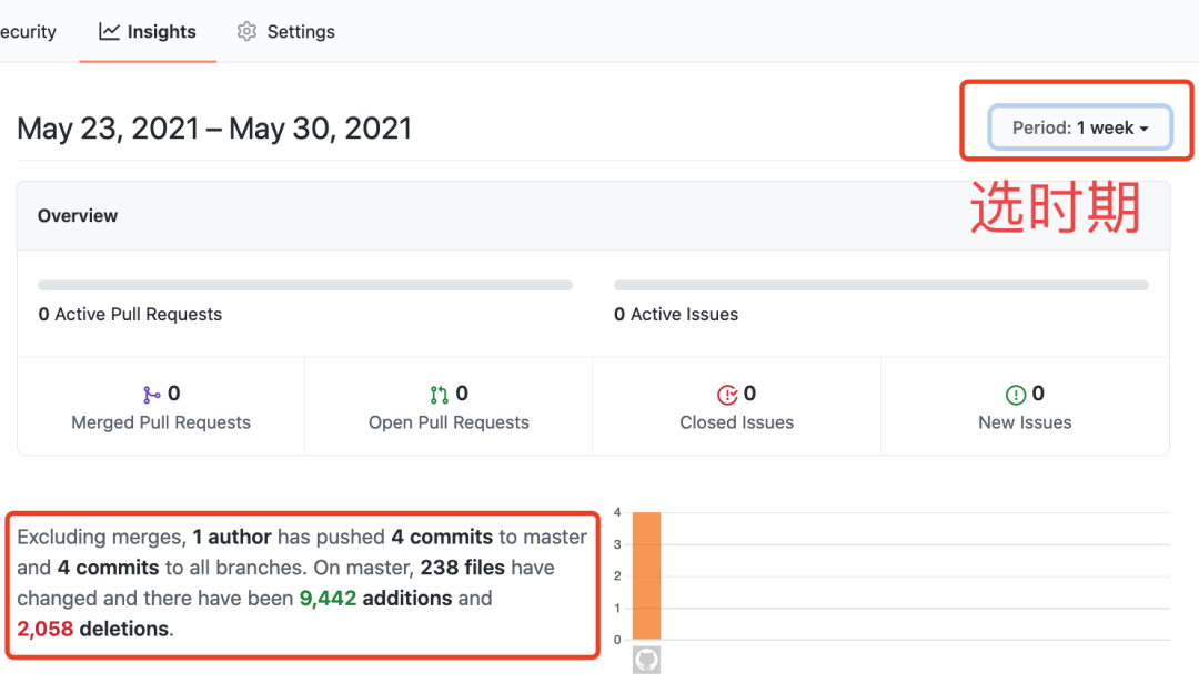 如果使用 GitHub 来管理你的代码,可以进入 insights 面板,能够看到指定时期的提交数、文件修改数、代码新增和删除数。