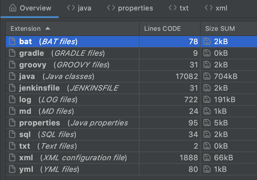 我举一些例子,比如 Java 和前端项目的一些配置和数据交换文件,比如 xml、yaml、yml、properties、conf、 json、proto 等。还有一些脚本文件,像 bash 脚本、bat 脚本、SQL 脚本等。还有一些工程化的文件,比如 gradle 项目管理,以及自动构建项目用到的 jenkinsfile 等。