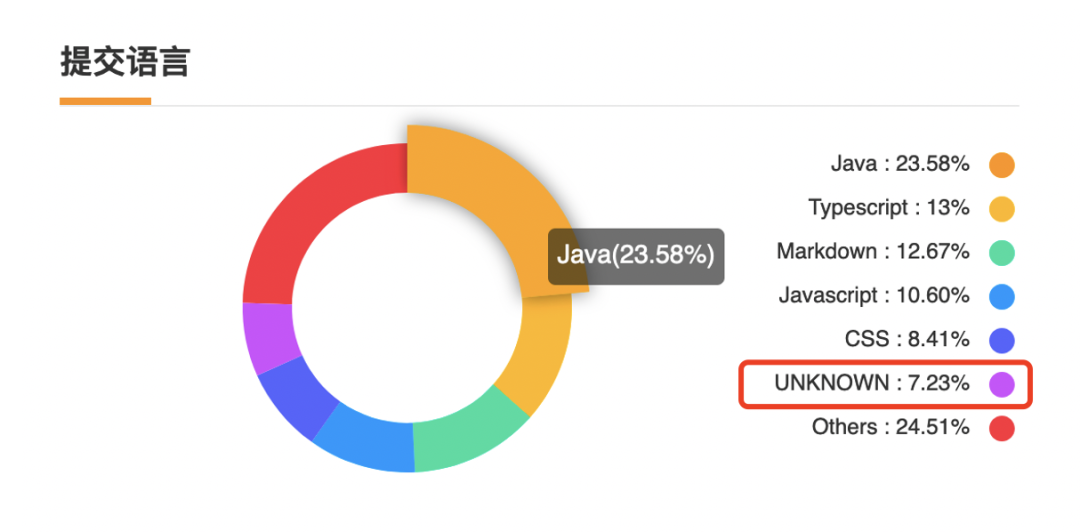 从饼图中,就能看出我这个月写了 23.58 % 的 Java、写了 30 % 左右的前端(TypeScript + JavaScript + CSS)、写了 12.67 % 的 Markdown、还有 30 % 左右的其他语言。