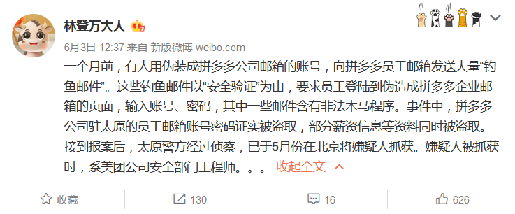 6月2日,中国警察网发布信息称,山西太原警方近期破获一起入侵计算机系统套取商业信息案,抓获犯罪嫌疑人曲某。据悉,该嫌疑人用伪装成拼多多公司邮箱的账号,向该公司员工邮箱发送大量“钓鱼邮件”,致使拼多多公司驻山西太原的员工邮箱账号密码被盗取,数份个人简历及部分薪资信息等资料遭到泄漏。
