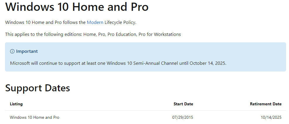 行吧,毕竟有了 Windows 10X 的前科,要说 Windows 11 是 Windows 10 之后的“最最后一个版本”倒也不是不能接受。可是微软连曾经声称是“Windows 最后一个版本”的 Windows 10 都没放过:近日,据 Windows 10 家庭版和专业版生命周期页面显示,微软计划于 2025 年 10 月 14 日结束对 Windows 10 的支持。