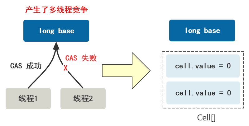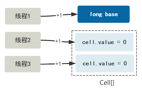 我们把一开始使用的唯一共享变量叫做 base,把之后开启的多个变量叫做 Cell 类,放在一个 Cell[] 数组里。Cell 类里只有一个变量就是 value,存储累加过程中的值。