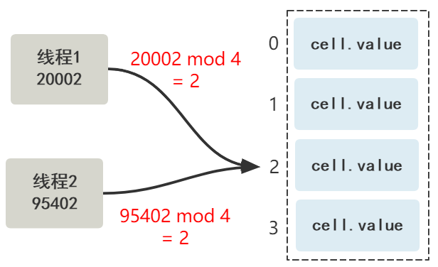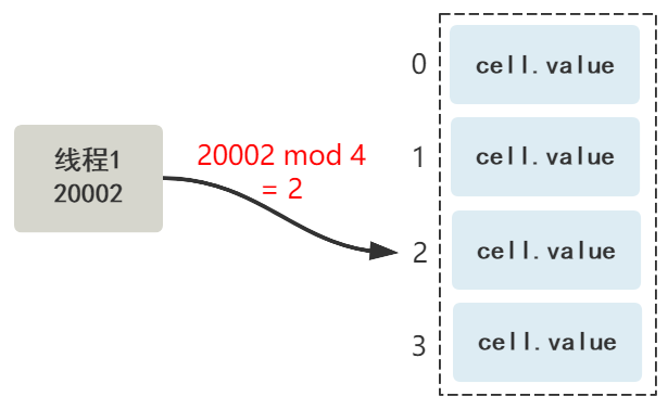 我们在每个线程中,维护一个局部变量,这个变量属于这个线程,这个变量的值根据 Cell[] 数组的大小哈希取模,就可以映射到其中一个 Cell 上了。