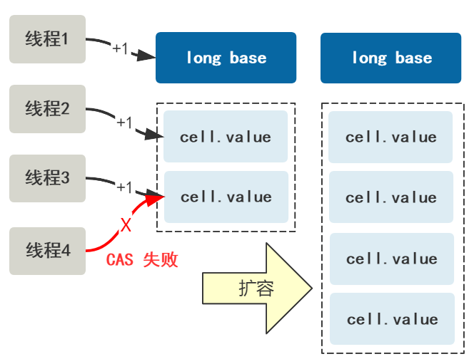 5. 如果此时又冲突,并且 CAS +1 又失败,那么将 Cell[] 数组扩容。
