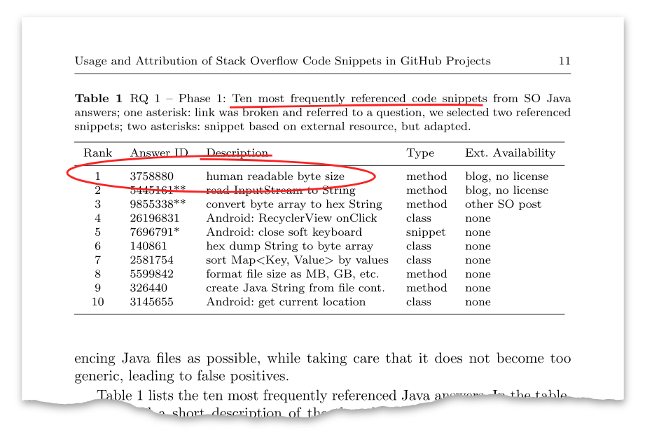 到了2018年,一位名叫Sebastian Baltes的博士生在《Empirical Software Engineering》杂志上发表了一篇论文,题为《Usage and Attribution of Stack Overflow Code Snippets in GitHub Projects》。该论文的主旨可以概括成一点:人们是否在遵守Stack Overflow的CC BY-SA 3.0授权?也就是说,当人们从Stack Overflow上复制粘贴时,会怎么注明来源?