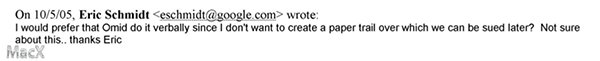 之后,当时兼任苹果董事和谷歌顾问的比尔·坎贝尔(Bill Campbell)向乔布斯发信,表示施密特亲自同意了与苹果的”互不挖墙脚“协议。为了保证这个协议的秘密程度,施密特在一封邮件中称不愿留下书面证据,以避免以后遭到起诉。