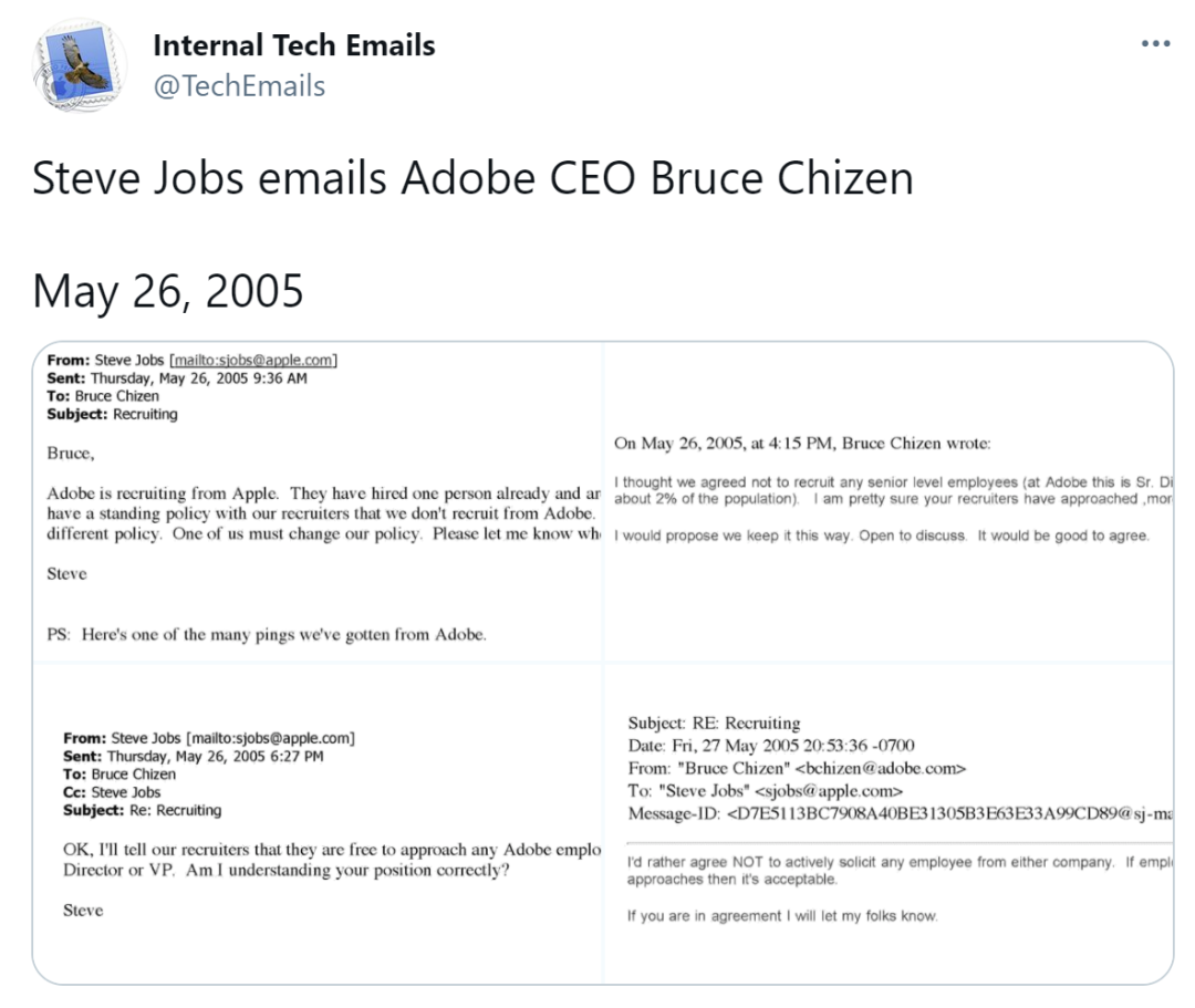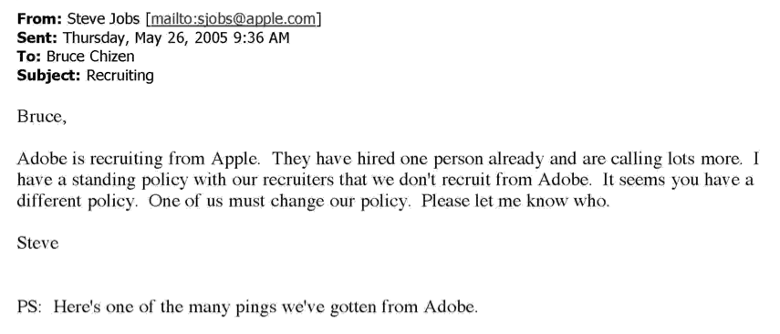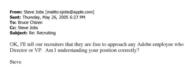 在第一封邮件中,乔布斯开门见山地表示:Adobe的招聘人员正在从苹果公司挖人,而且已经挖走了一个人,后续还打算挖走更多人。并且乔布斯还表示,苹果公司里有一项政策:从来不让苹果的招聘人员从Adobe挖人。
