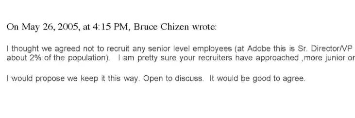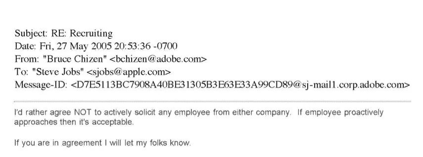 然而,大概五个小时之后,布鲁斯就不甘示弱地回复了乔布斯的邮件:他认为Adobe和苹果只是就“不挖角高级员工”这件事达成了一致,在Adobe,高级员工代表高级总监/副总裁一类的人员,大约只占总员工数的2%。
