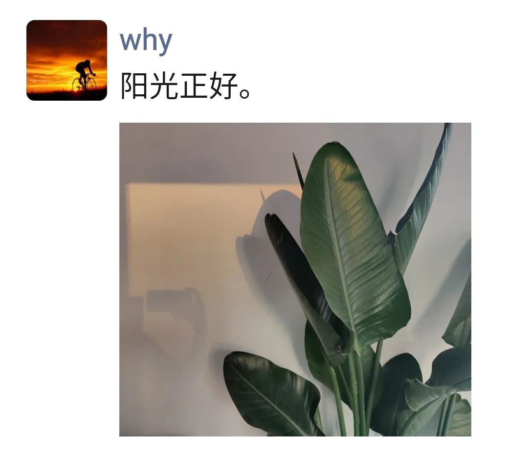 写到这里的时候女朋友叫我回头望一眼,一缕阳光正从窗户射进来,打在客厅的绿植上,墙上印出斑驳光影。