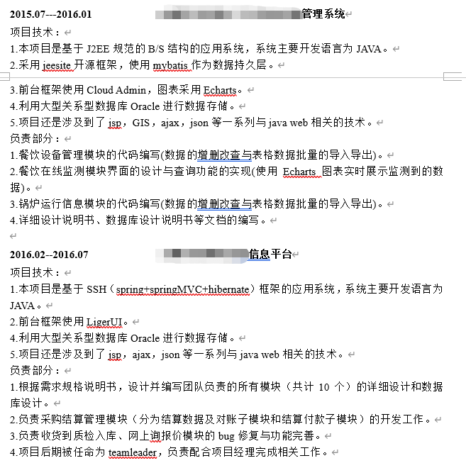 个人技能那里,把“开源技术”写成“来源技术”就不说了。项目经历一看就是属于那种政府外包的管理后台类项目,毫无技术深度可言。