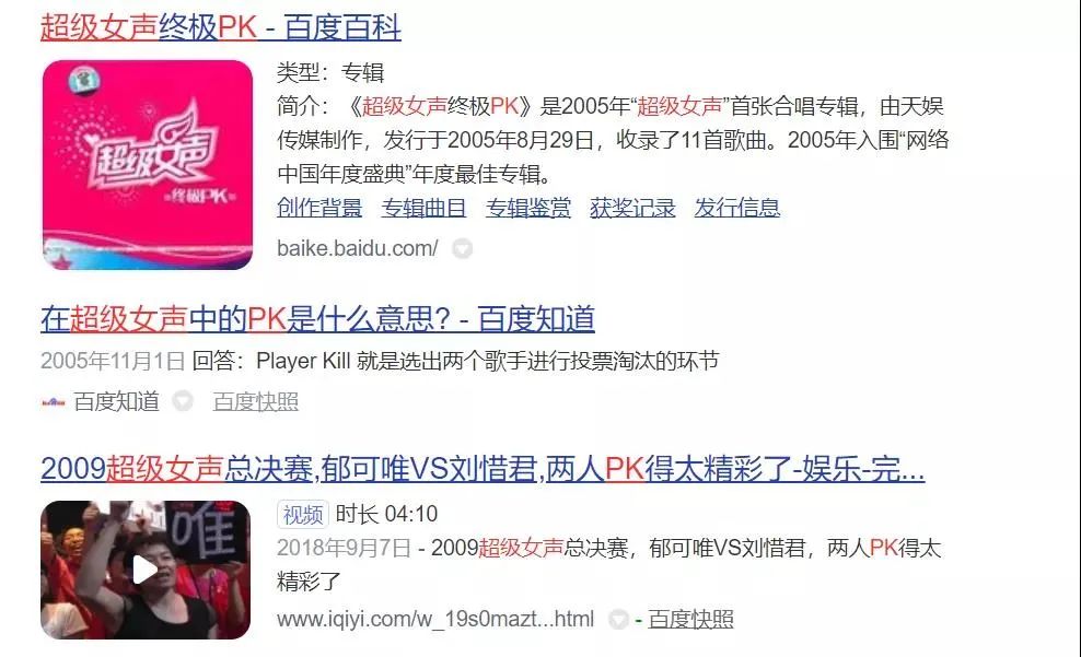 比如当年红的发紫,开创了选秀类节目的《超级女声》,就用“PK”一词来指代节目的对抗比拼环节。