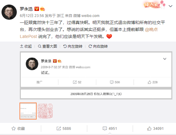 6月12日深夜,锤子科技CEO罗永浩在微博宣布,自己将退出微博和所有的社交平台,再次埋头创业去了。