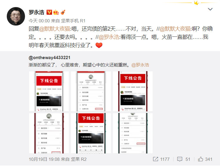 而2021年10月,罗永浩在回复微博网友时透露,自己明年春天就重返科技行业了。随后他还强调,在还完款的当天就回。