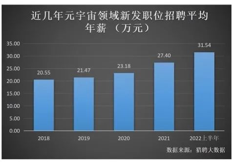在政策和市场的双重促进下,元宇宙行业的技术人才招聘也一直热潮不退。据新浪VR联合猎聘发布的《2022元宇宙人才发展白皮书》显示,从新发职位招聘年薪来看,到2022年上半年,元宇宙领域新发职位人才的平均年薪达到了31.54万元,远高于2021年的27.4万元,与2021年上半季度相比同比增长约21%。
