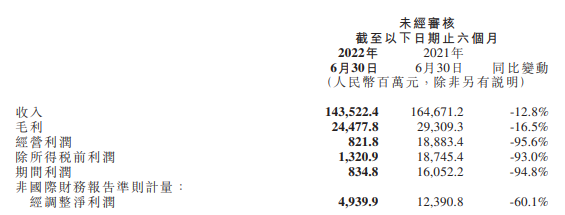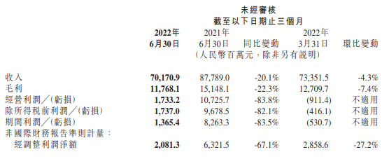 其中,二季度收入为702亿元,同比下降20%;经调整利润20.8亿元,同比减少67.1%。