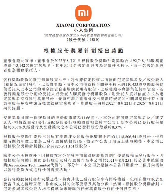 截至公告日前一个交易日,小米集团8月19日的股份收盘价为11.66港元/股,据此计算,此次小米集团给员工的股份奖励总额约10.81亿港元(约合人民币9.42亿元),人均奖励约30万元。