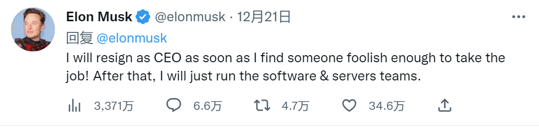 去年 12 月 21 日,马斯克发推称:“只要找到一个足够愚蠢的人愿意接下这份工作,我马上就辞去 CEO 的职务。”