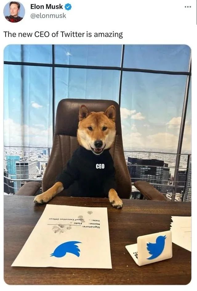 昨天,马斯克连发多条推文称,自己已为 Twitter 找到了一位新 CEO,配图则是一只柴犬。柴犬身着带“CEO”字样的服饰,桌上的签名文件上写有它的名字—— Floki。同时,马斯克配文称它非常棒、非常擅长数学,是完美的继承人人选。