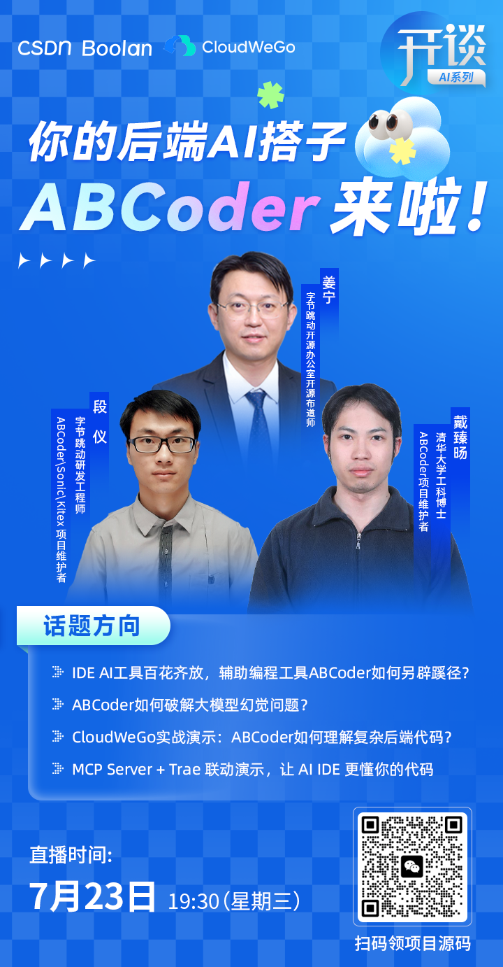在 7 月 23 日 19:30 的「你的后端 AI 搭子,ABCoder 来啦」直播中,字节工程师将深入解读 ABCoder 的实现原理,并探索其在后端开发中的实战应用。