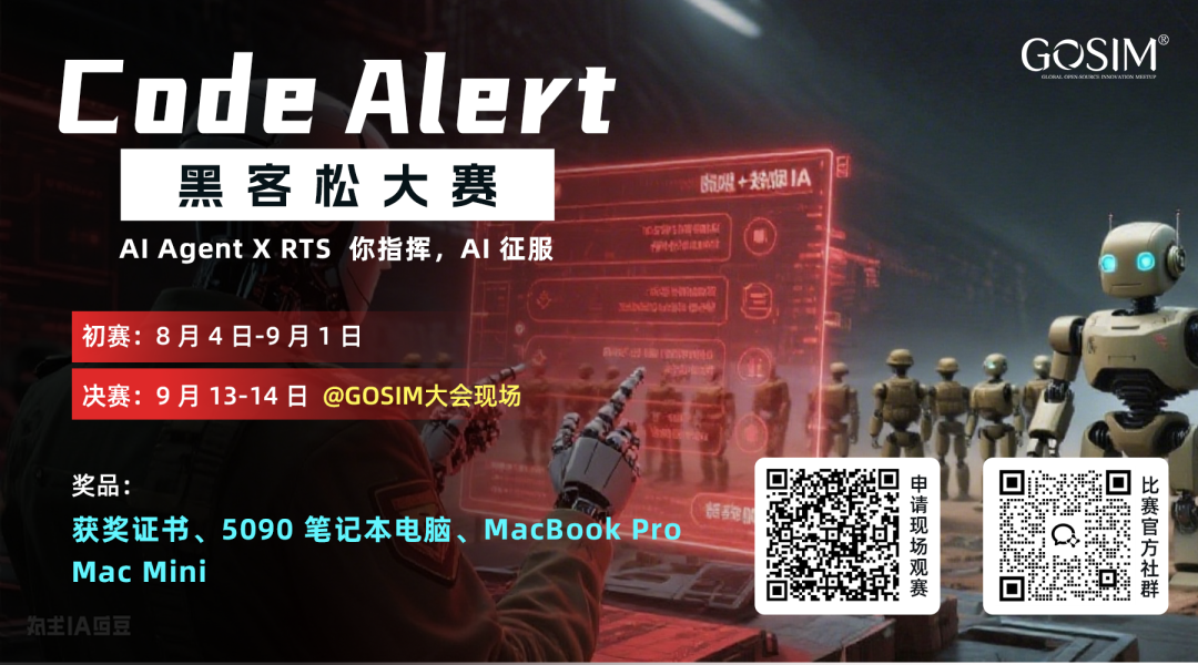 由 GOSIM Hangzhou 2025 发起,mofa.ai 和 e代驾联合举办的实验级对抗赛——GOSIM Code Alert:红警指挥官对抗赛决赛在即,届时除了线上直播,Code Alert 主办方还特向 GOSIM HANGZHOU 2025 组委会申请了黑客松大赛线下专属入场券,数量不多,先到先得。
