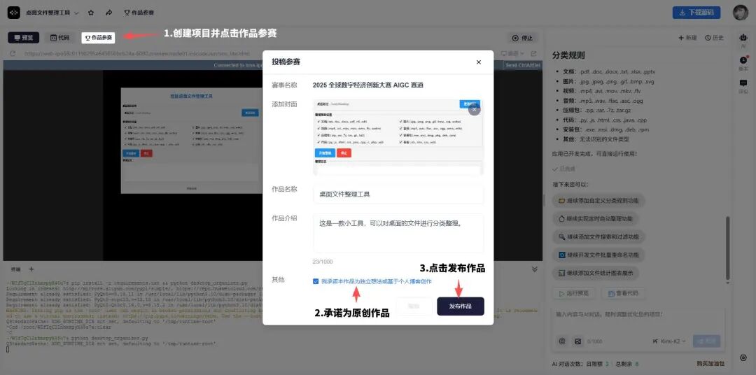我们摒弃了一切繁琐的提交流程。当你生成出一个项目后,你会在页面上看到一个清晰的 「作品参赛」 按钮。