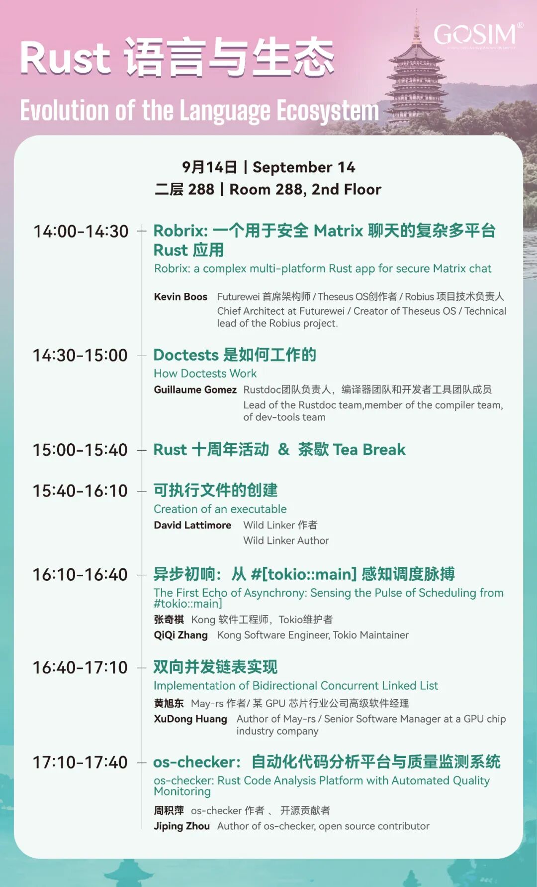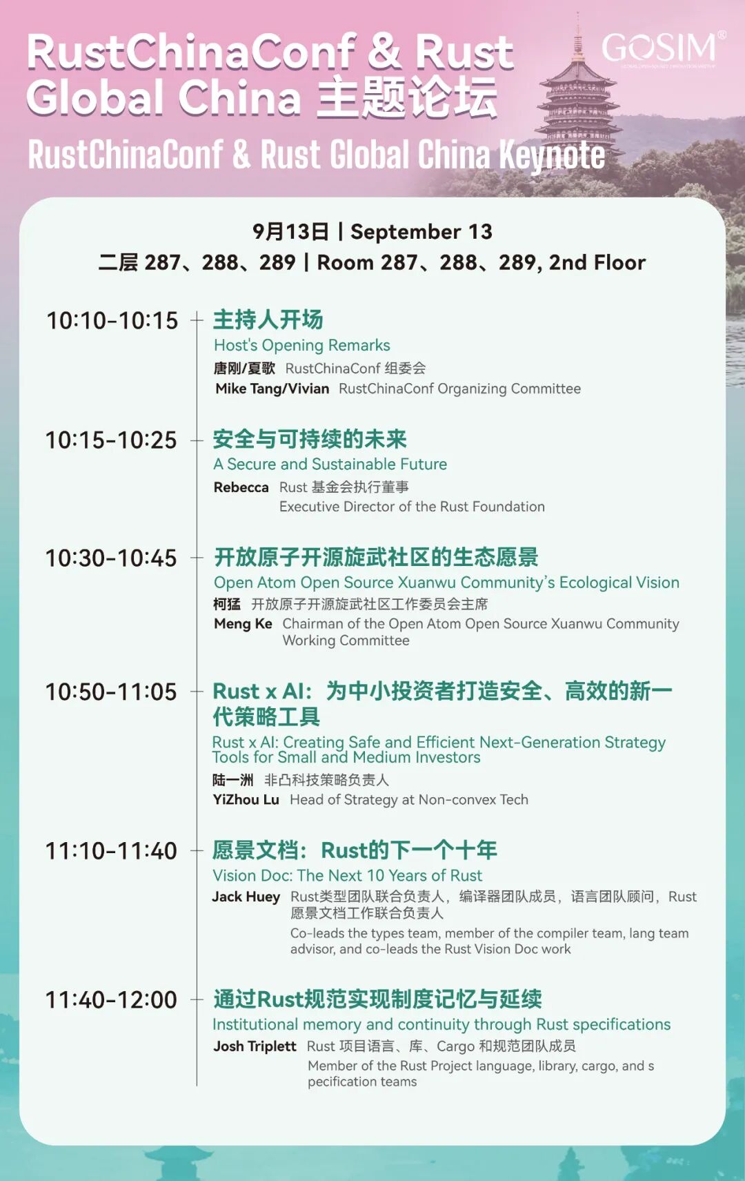 RustGlobal + RustChinaConf 将首次与 GOSIM 同台,设置行业深度应用、语言生态进化、基础设施 AI × OS 革新三大分论坛,庆祝 Rust 稳定版发布十周年。