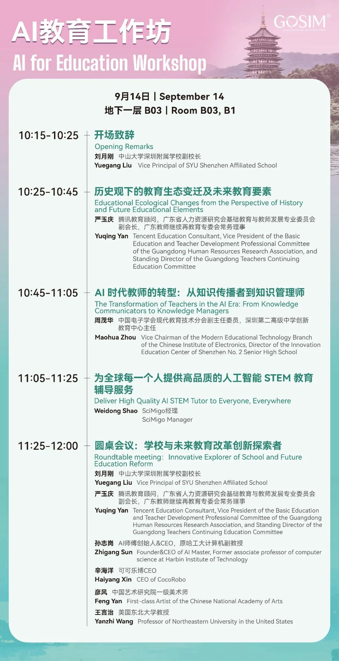 9 月 14 日上午,AI 教育工作坊探讨智能技术赋能教育的创新模式;开源出海工作坊分享中国开源项目走向全球的经验与路径。