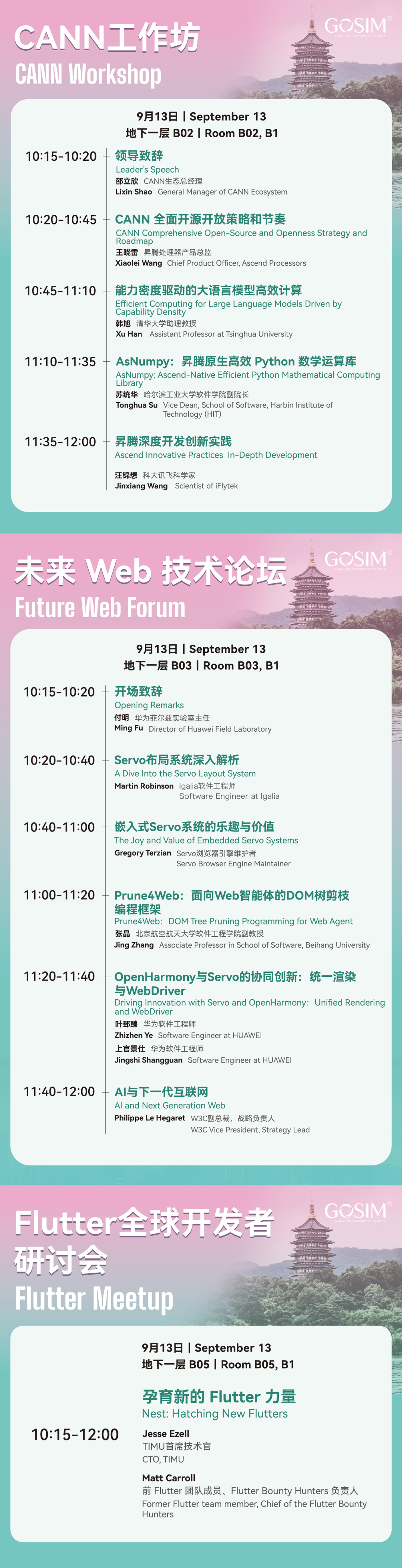 9 月 13 日上午,CANN 工作坊将带来昇腾计算与高性能推理实践;未来 Web 技术论坛聚焦 Web 内核与 AI 智能体结合的最新技术与实践;Flutter 全球开发者研讨会分享跨平台应用的最新进展。